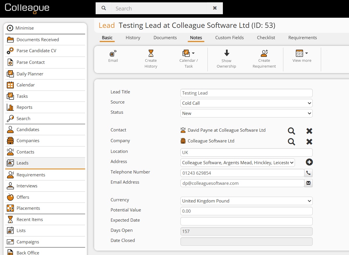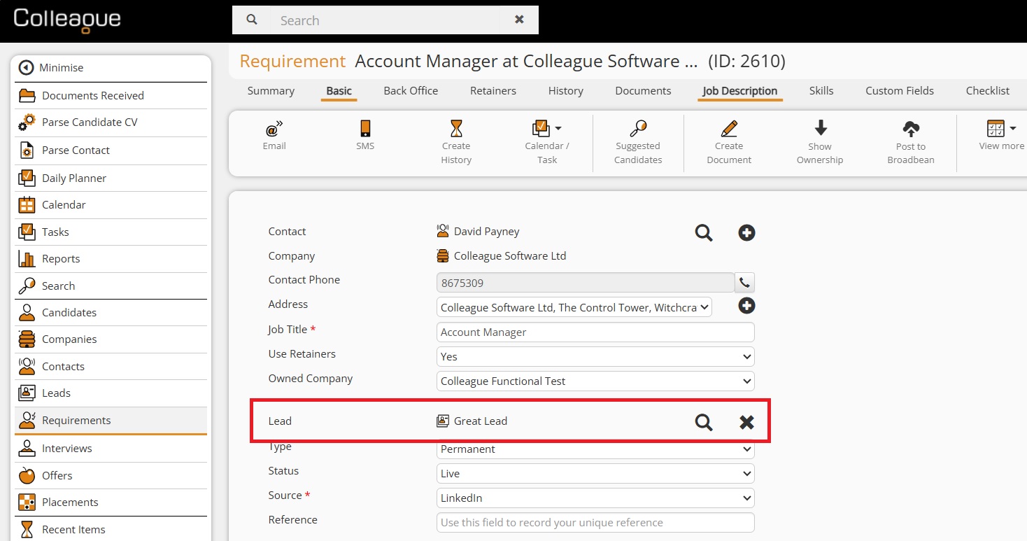 When a Requirement has been created (or if multiple Requirements have been created) from a Lead record, you will be able to access the Requirements from the Requirement tab. When on a Requirement, if it has been created from a Lead you will have a link back to the Lead record.