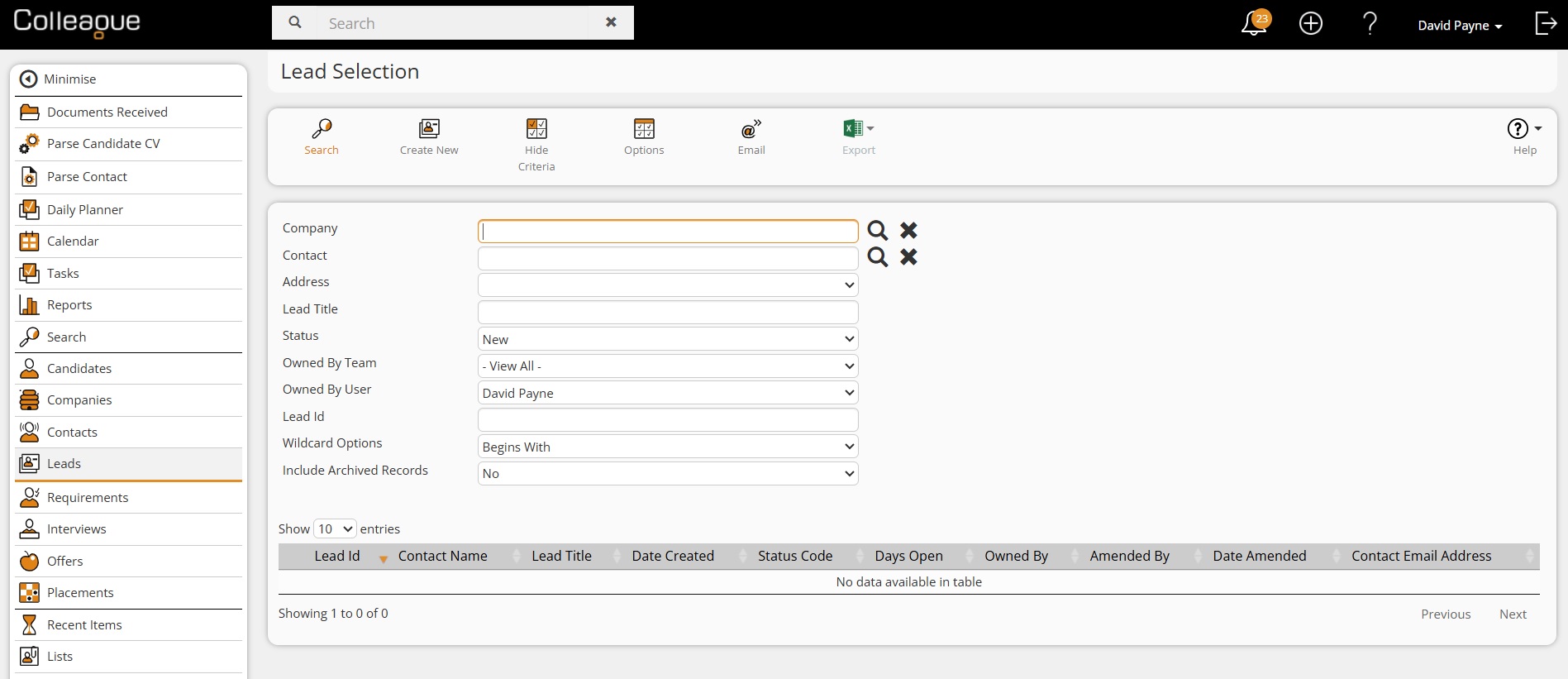 On selection of the Leads option, you will be able to search for existing Leads via a selection screen:
